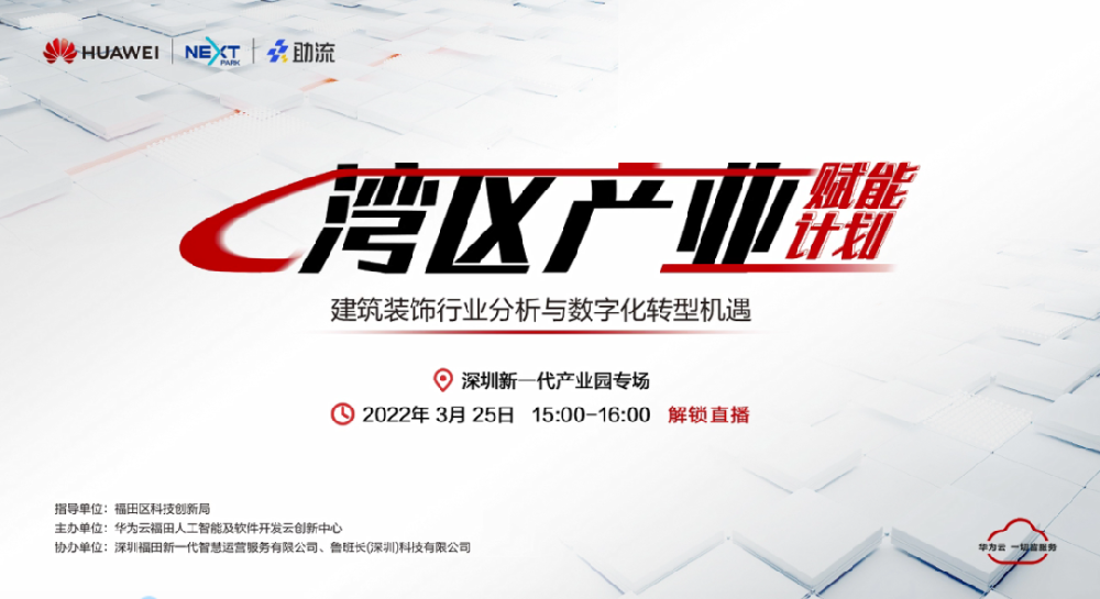 2022年3月25日,華為云福田人工智能及軟件開發云創新中心聯合魯班長(深圳)科技有限公司、深圳新一代產業園舉辦了首期“灣區產業賦能計劃”線上直播,特邀建筑數字化轉型專家葉國鋒老師,為觀眾做《建筑裝飾行業分析與數字化轉型機遇》主題直播分享。